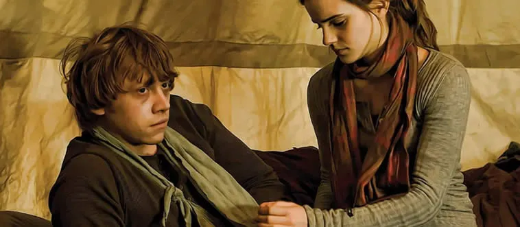 In which book does Hermione first kiss Ron?
